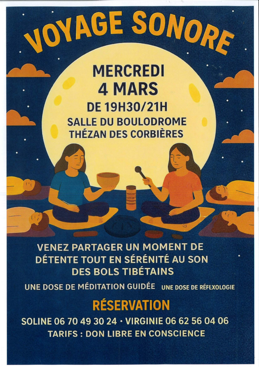 Date Mercredi 04 Mar 2026 19:30 Venez partager un moment de détente tout en sérénité au son des bols tibétains.Salle du boulodrome Thézan des Corbières